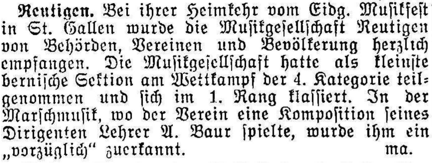 Die MG Reutigen am Kantonalmusikfest in Thun 1925